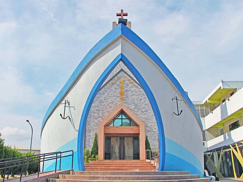 磐頂教堂是台灣目前現存的船型教堂裡保存的較為完整且顏色最為鮮艷吸睛的一座,配色採用地中海式的經典白加藍,清爽簡潔的顏色讓來參觀的民眾宛如置身在南歐地中海,吸引許多人前來參觀打卡。