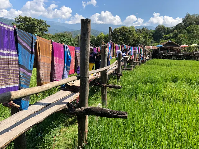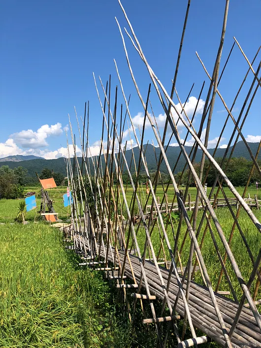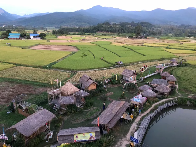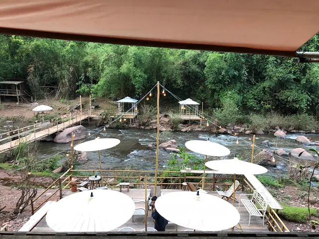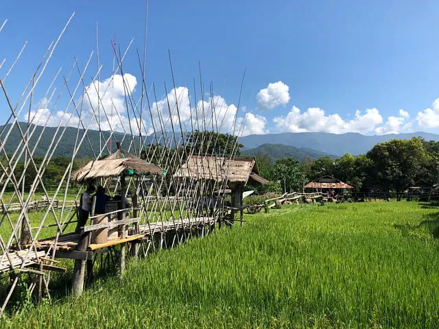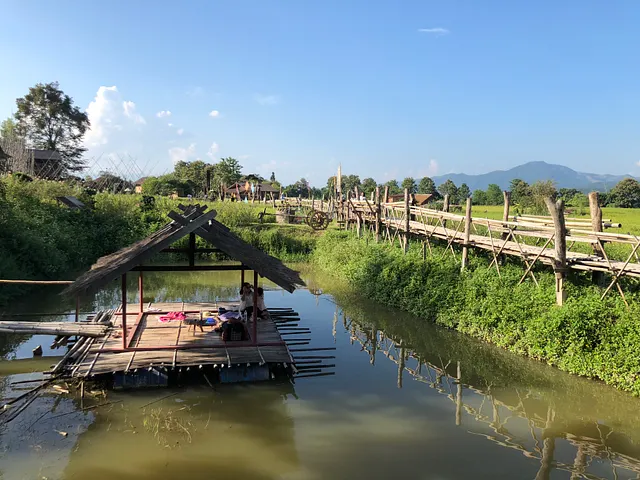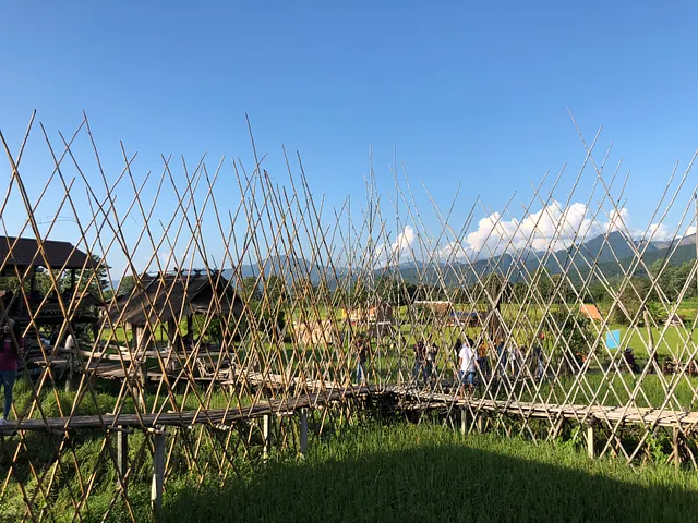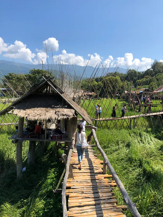 接著來到了很有特色的傣仂之家Bantailue Cafe(กาแฟบ้านไทลื้อ),竹架和木板在稻田上方交錯成通道,旁邊有很多發呆亭可以讓你躺躺坐坐一陣子,不過建議下午4點之後再來,不然真的很炙熱。另外記得先找位置再去入口處點飲料,每個發呆亭都很搶手,而且大家都躺至少半小時以上。