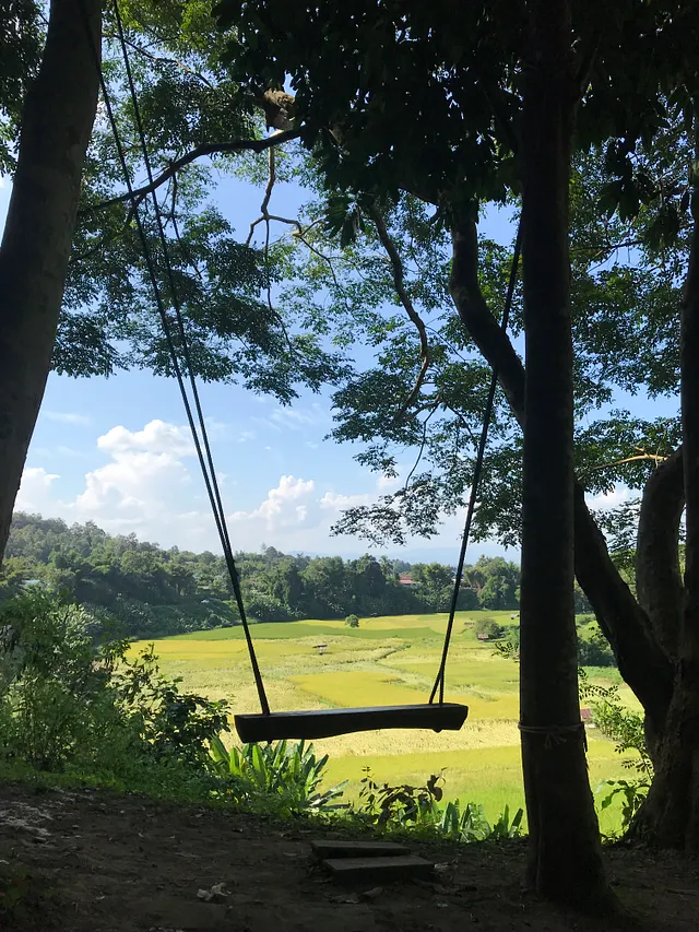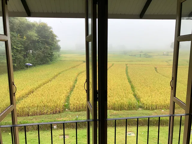 另外一家是在agoda上訂的南斯里潘納飯店,Nan Sripanna Resort(น่านศรีปันนา รีสอร์ท),沿著稻田邊的兩層樓建築,房間窗戶一打開就是印入眼簾的整片金色稻穗,再晚個1–2週可能就要收割了,收割後面對光禿的稻田可能就不這麼美麗了。這家民宿也有提供簡單的早餐,但是相較之下月亮之家真的大勝。