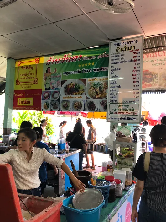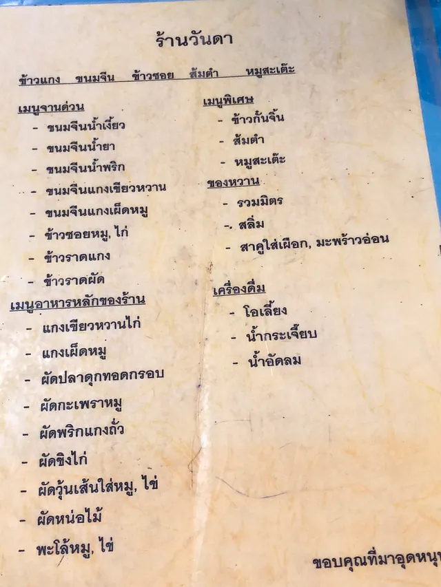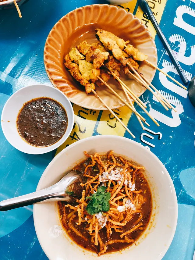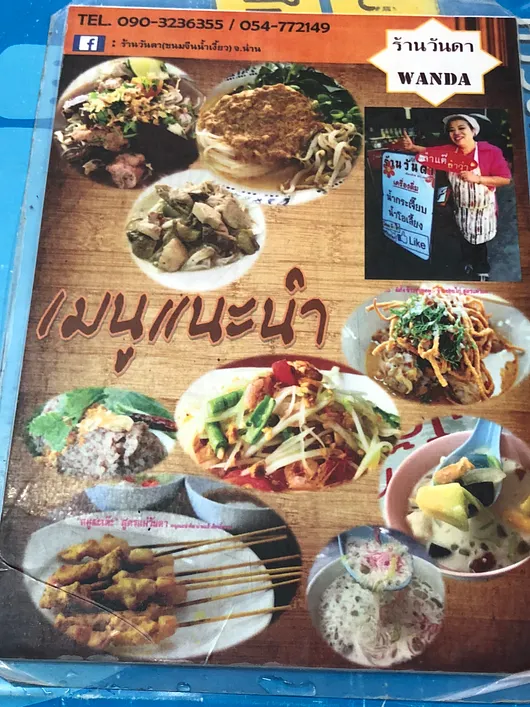 請民宿推薦好吃的咖哩麵Khao soi (ข้าวซอย),他們建議ร้านวันดา / Wanda,推薦菜色咖哩豬40銖、咖哩雞50銖、豬肉沙嗲一串5銖,單點青木瓜沙拉30銖、中式米線加醬30銖、炒菜每盤35銖,加冰飲料一杯12銖,物價真的比曼谷低很多!!