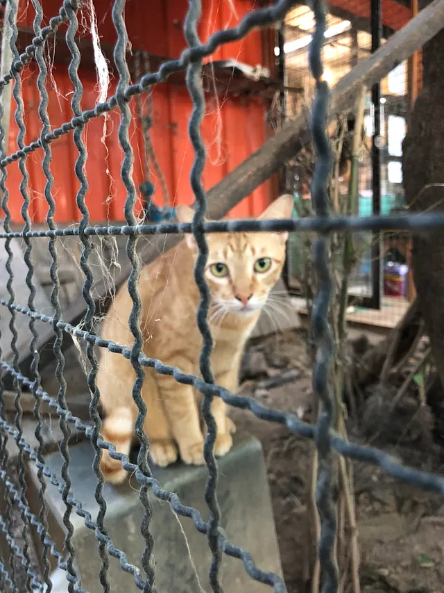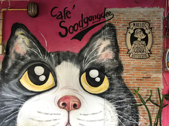 同行的朋友帶我們到Cafe’ Soodgongdee (คาเฟ่ สุดกองดี)逗貓順便喝咖啡,但店家飼養的環境跟一般貓咖啡不太一樣,用鐵網繞著一顆大樹垂直往上到建物2樓,算是半露天的固定範圍飼養,不過可以理解店家在豢養的同時又希望貓星人們具有爬樹的技能(?)