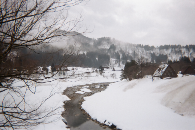 雪景覆蓋了整個山谷與小村落,柔和的灰白色調營造出安穩的氛圍