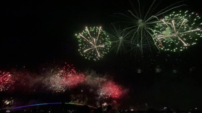 大家鋪著野餐墊,拿著消夜、飲料,等著那場令人期待的煙火秀登場。