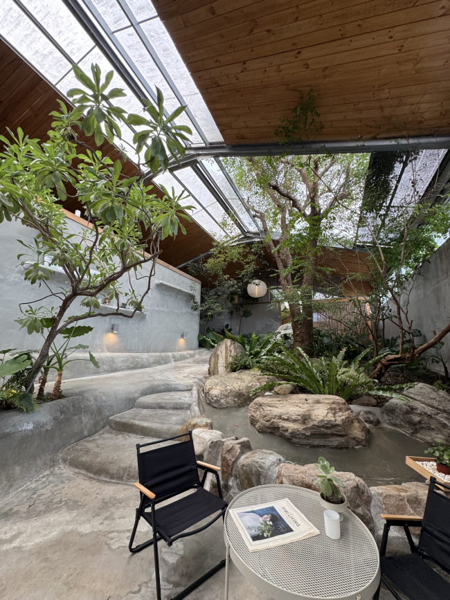 走進Lobby「The Mist Gallery」半戶外透過穹頂灑落的溫煦天光,以及以老樟樹和蕨類構成的雨林光影