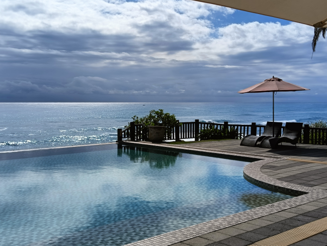 照片中,是位於在花蓮的斯圖亞特海洋莊園飯店裡的無邊無際的泳池而在泳池的旁邊就是美麗的太平洋,讓旅客一早起來之後,游泳完,接著就可以躺在躺椅上休息這真是人生的一大享受,非常的療癒,在心情上也能感到有心曠神怡的感覺。 Likes 1